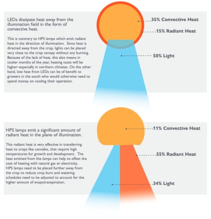 LEDs dissipate heat away from the illumination field as convective heat, unlike HPS lamps which emit radiant heat towards the crop. This allows LEDs to be placed closer to the crop canopy without burning, reducing heating costs in cooler months. In southern regions, the lower heat from LEDs can reduce cooling expenses.
